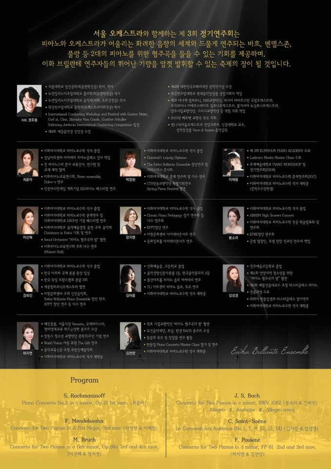 서울 오케스트라와 함께하는 제3회 정기연주회는 피아노와 오케스트라가 어울리는 화려한 음향의 세계와 드물게 연주되는 바흐, 멘델스존, 풀랑의 2대의 피아노를 위한 협주곡을 들을 수 있는 기회를 제공하며, 이화 브릴란테 연주자들의 뛰어난 기량을 맘껏 발휘할 수 있는 축제의 장이 될 것입니다.