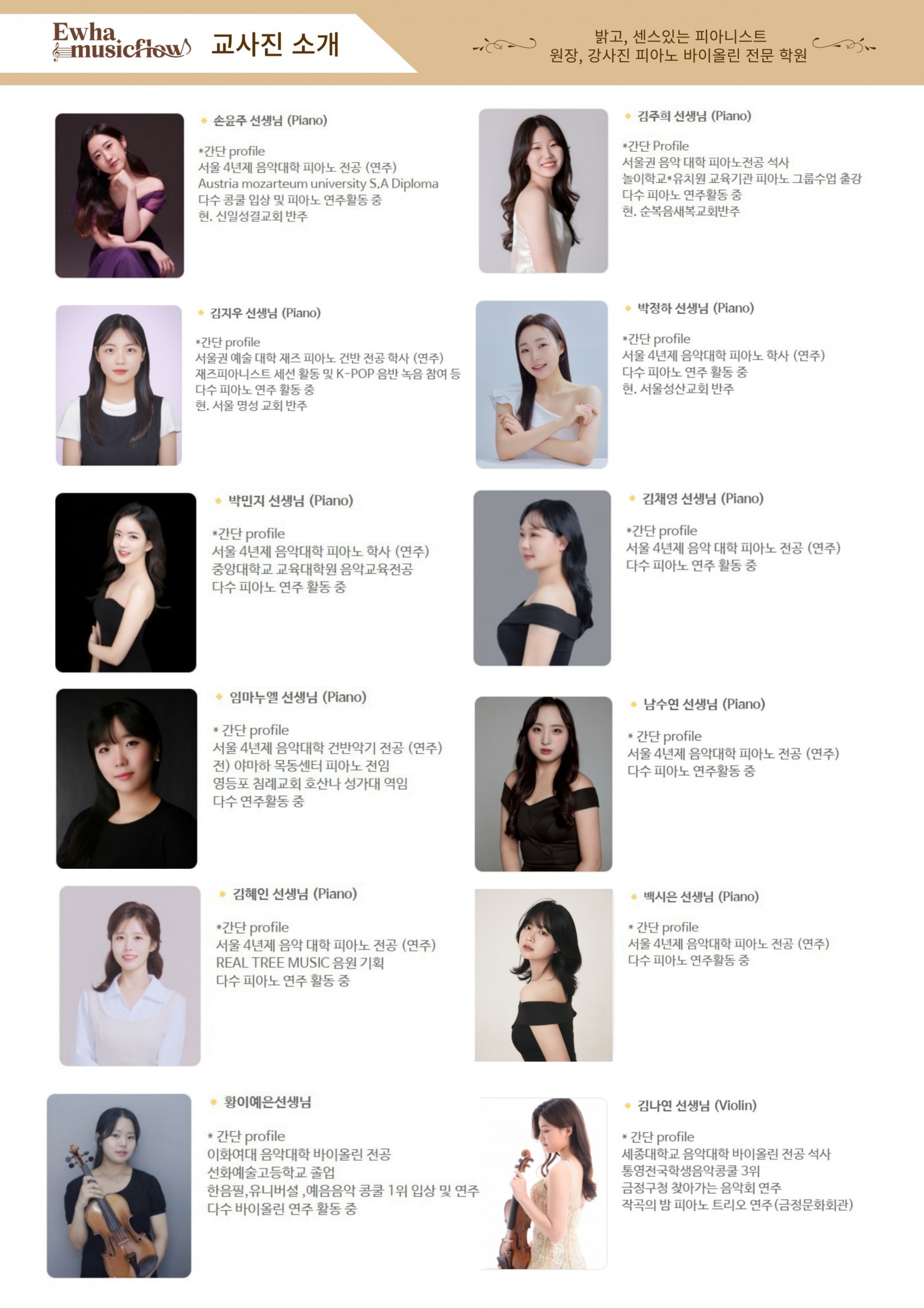 피아노 전공(11명),바이올린전공(2명) 선생님들이 있습니다 .