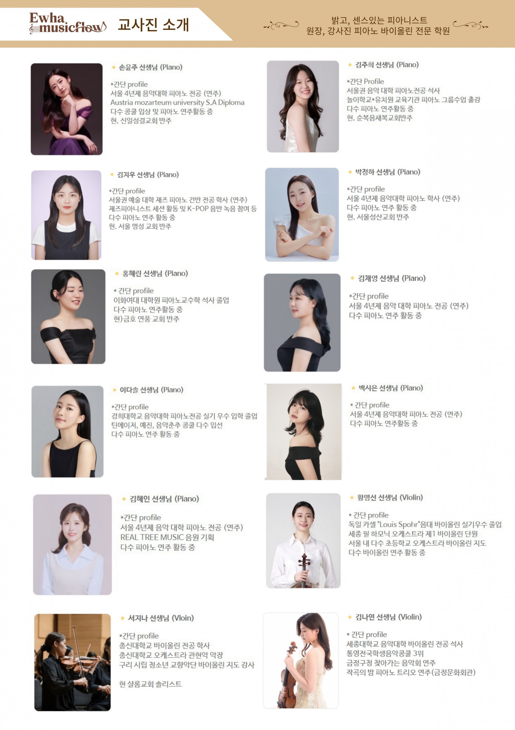 피아노 전공(10명),바이올린전공(3명) 선생님들이 있습니다 .